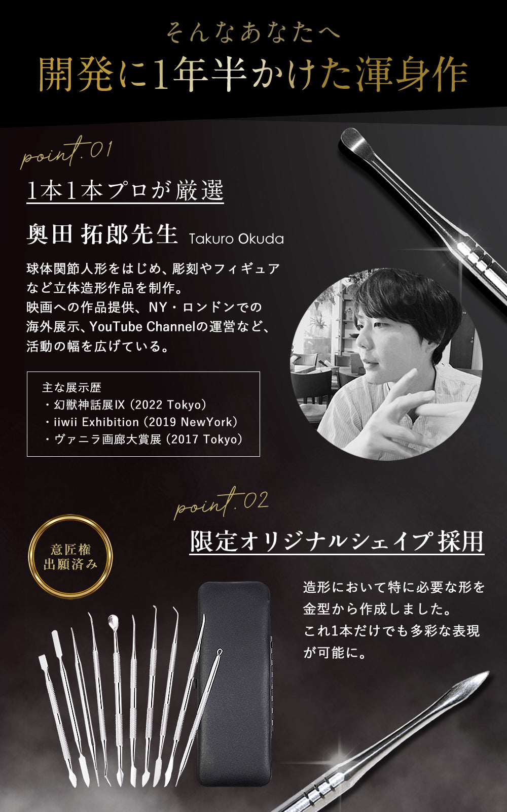 あの有名映画の「バロン」を制作した奥田さんが厳選。目的が不明瞭なスパチュラセットが溢れる中で、本当に必要な形状を厳選し、 世にない形状は1年をかけて0から開発。独自形状モデルのDS2は今では奥田さんの愛用モデルとなっています。